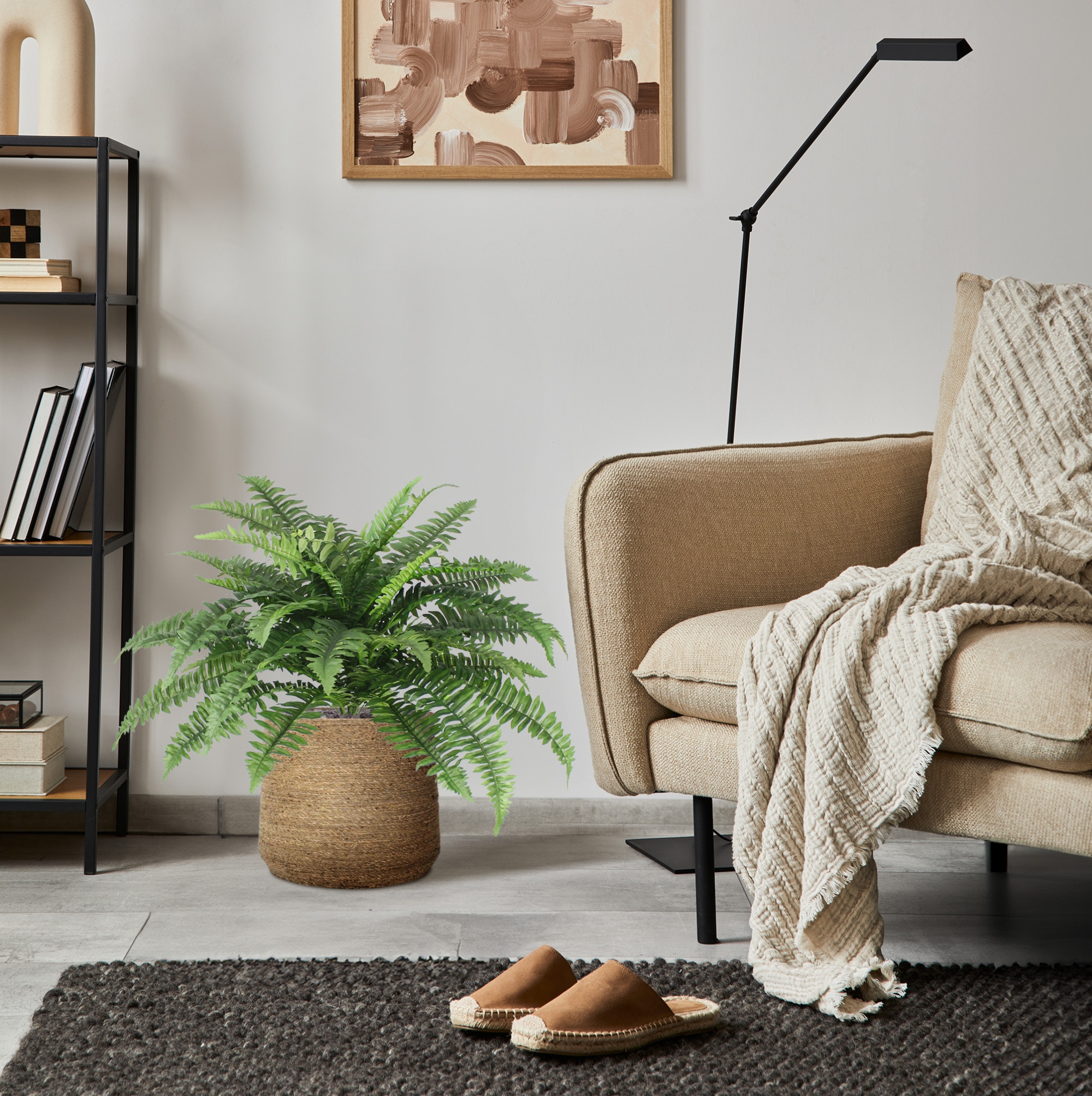 Ontdek de tijdloze schoonheid van de Boston Varen kunstplant, een iconische keuze voor groene interieuraccenten. Met een diameter van 65 cm op het breedste punt en een hoogte van 50 tot 55 cm, inclusief een steel van ± 14 cm, voegt deze luxe kunstplant moeiteloos een vleugje natuurlijke elegantie toe aan elke ruimte.