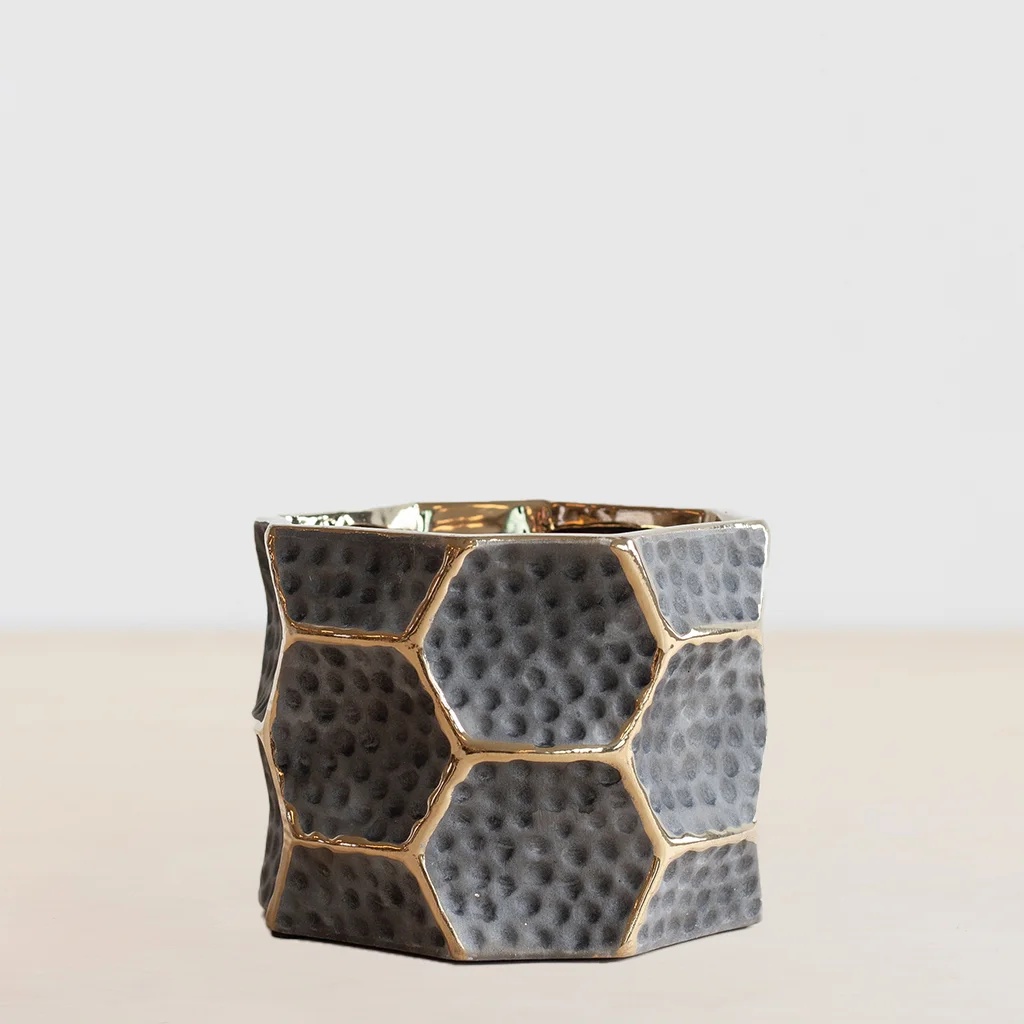 De Bursa plantenpot is een echte blikvanger. De hoge, cilindervormige pot is gemaakt van grijs keramiek met een goudkleurig honinggraat patroon. Deze bloempot maakt jouw plant extra bijzonder! Combineer de Bursa pot met een elegante, groene plant en geniet van een stijlvol geheel. Deze plantenpot is geschikt voor kamerplanten (https://www.plantje.nl/kamerplanten/) met potmaat 12. De Bursa bloempot is gemaakt van keramiek. Het goudkleurige patroon is gegalvaniseerd. De pot is 14,5 cm hoog en 14,5 cm breed. Tip: vind je deze kleuren mooi, maar ben je op zoek naar een andere vorm bloempot? Neem ook eens een kijkje bij onze Ankara pot (https://www.plantje.nl/ankara-goud-grijs-p13/)!