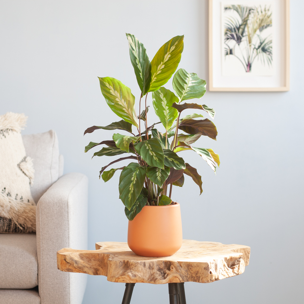 De Calathea maui queen (schaduwplant) is een kamerplant waar je naar kunt blijven kijken. De donkergroene bladeren hebben een crèmekleurig patroon, dat er haast opgeschilderd lijkt te zijn. De dieppaarse onderkant van de bladeren maakt dit plaatje helemaal af. De Calathea maui queen is onderdeel van de Marantaceae familie. Dit zijn kamerplanten (https://www.plantje.nl/kamerplanten/) die ook wel prayer plants worden genoemd; een bijnaam die ze danken aan hun ochtend- en avondritueel. De schaduwplant beweegt haar bladeren namelijk omhoog in de avond, om ze 's ochtends weer te laten zakken. Deze beweging heeft iets weg van biddende handen. De Calathea komt van oorsprong uit de regenwouden van Brazilië. Hier groeit de plant veel onder grotere planten en bomen, waardoor hij niet gewend is aan direct zonlicht. De Calathea geeft de voorkeur aan een plekje in de halfschaduw, waardoor deze kamerplant ook wel een schaduwplant wordt genoemd. Let op! – Je kunt de Calathea het beste regenwater of