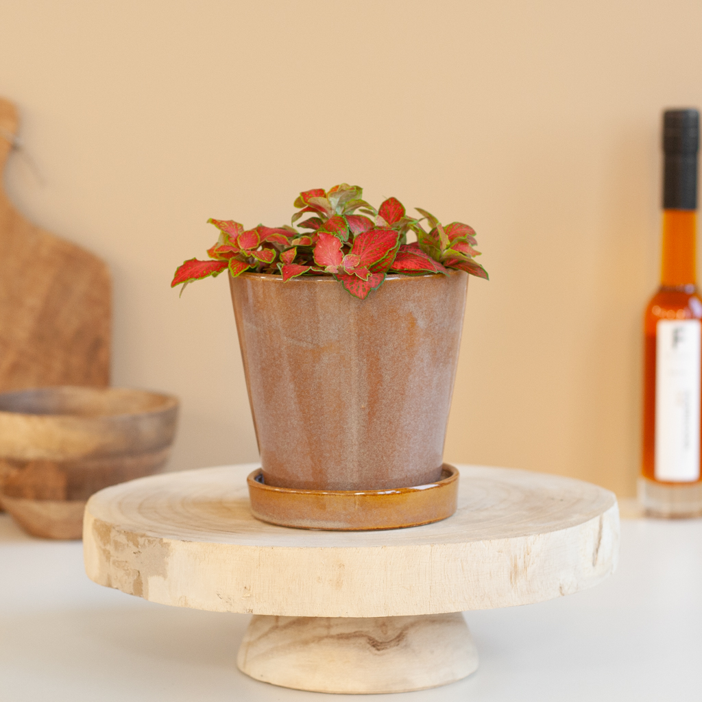 De rode Fittonia (Mozaïekplant) is een echte kleurenexplosie in jouw woonkamer. Deze van oorsprong Peruaanse oerwoudplant houdt van een hoge luchtvochtigheid, en is daardoor perfect voor in een terrarium. De Fittonia staat bekend om zijn opvallende bladpatroon, waardoor hij ook wel Mozaïekplant wordt genoemd. Deze variant springt echt in het oog, met knalrode bladeren en felgroene nerven. Van oorsprong komt de Fittonia uit Peru. Hier kruipt hij over de bodem van het oerwoud. Hoewel het plantje hier vaak niet hoger dan 15 cm wordt, kan hij dubbel zo breed groeien. Binnenshuis is de Fittonia bij uitstek geschikt als terrariumplant. Hij houdt namelijk van een hoge luchtvochtigheid en kan slecht tegen kou/tocht. Let op! – Zorg voor een hoge luchtvochtigheid door de plant in een terrarium of naast een schaaltje met water te plaatsen. Zet de Fittonia niet in de buurt van de verwarming of op de tocht. Lichtbehoefte – Plaats de Fittonia nooit in direct zonlicht. Hij groeit het mooist op een