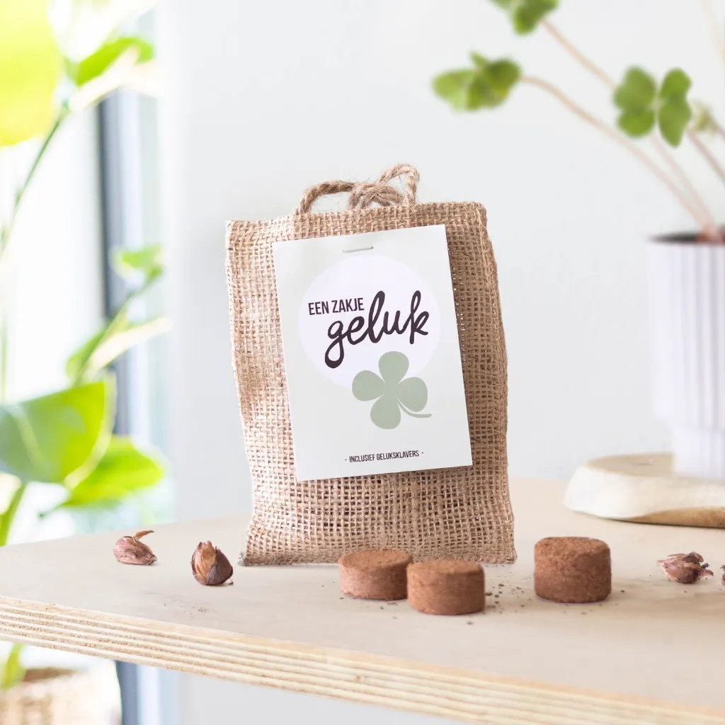 Met het groene gelukszakje kweek je jouw eigen geluk in de vorm van klavertjes vier. Een leuk item om cadeau te doen of voor jezelf te kopen wanneer je wel wat geluk nodig hebt. Het klavertje vier wordt al eeuwen gezien als een gelukssymbool. Het is een mutatie van de witte klaver, die normaal gesproken maar drie blaadjes heeft. Het klavertje vier heeft een bijzondere betekenis, elk blad staat namelijk ergens voor. De bladeren staan voor geluk, hoop, vertrouwen en liefde. Dit 'zakje geluk' wordt geleverd door de brievenbus in een bijpassende brievenbusverpakking. Dit item bestaat uit een jute zakje met grondtabletten en bollen. Met deze bollen krijg je gegarandeerd eindelijk een klavertje vier te zien! De bollen kunnen het hele jaar door in de tuin geplant worden of in een pot. Zo kan je ook binnen van dit geluk genieten! Let op! Het klavertje vier kan niet goed tegen vorst. Probeer ‘m tijdens de winter niet buiten te zetten. Lichtbehoefte: Dit plantje is niet erg moeilijk. Hij kan de