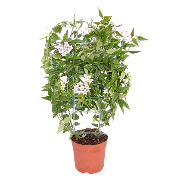 De Hoya Bella, ook bekend als de kleine wasbloem, is een charmante bloeiende kamerplant. Deze plant is beroemd om zijn prachtige trosjes met stervormige witte bloemen die een roze hart hebben. Deze bloemen geven de Hoya Bella een delicate en sierlijke uitstraling. Deze kamerplant kan zowel klimmen als hangen, wat hem veelzijdig maakt in het gebruik binnen verschillende interieurstijlen. De Hoya Bella is afkomstig uit Australiƫ, waar hij groeit in warme en licht vochtige omgevingen. De verzorging van deze kamerplant is vrij eenvoudig, wat hem een uitstekende keuze maakt voor zowel beginnende als ervaren plantenliefhebbers. Hij heeft een voorkeur voor veel licht, maar direct zonlicht moet vermeden worden om de tere bloemen te beschermen. Een plek met half schaduw of indirect licht is ideaal voor deze kamerplant. Met zijn exotische oorsprong en opvallende bloemen is de kamerplant een prachtige toevoeging aan elk interieur. Verzorging De verzorging van de Hoya Bella is gelukkig niet