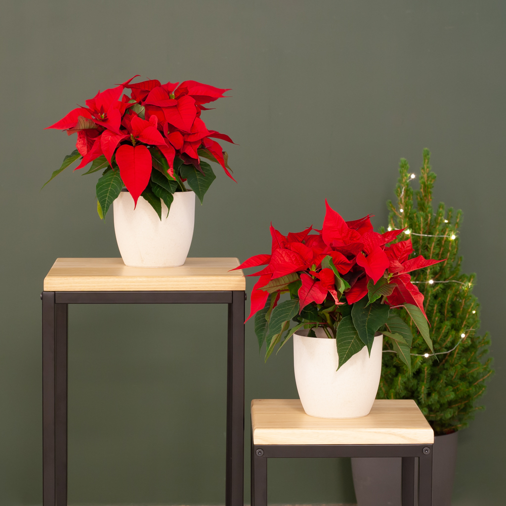 Dit Kerststerren Duo (Euphorbia pulcherrima) zijn de ultieme kerstplanten. Bij aankoop van dit product ontvang je twee mooie Poinsettia's. Met hun knalrode schutbladeren en donkergroene bladeren brengt het de kerstster direct in huis. De kerstster komt van oorsprong uit Mexico. Hier groeit de plant als een struik, die wel 4 meter hoog kan worden. Deze gekweekte kerstster heeft gelukkig een wat meer bescheiden formaat. Je kunt er altijd wel een plekje voor vinden, wat het ook een ideaal kerstcadeau maakt. De verbinding tussen de kerstster en kerst komt voort uit een Mexicaanse legende. Het verhaal begint met een arm kind genaamd Pepita, dat op kerstnacht een cadeau aan Christus wilde geven. Ze had geen geld, dus plukte maar wat onkruid en maakte hier een boeket van. In de kerk begon dit boeket met rode en groene bloemen te bloeien, wat als een echt kerstwonder werd gezien. Vanaf dat moment werd de kerstster ‘Flores de Noche Buena,’ oftewel Bloem van Kerstavond genoemd. De kerstster