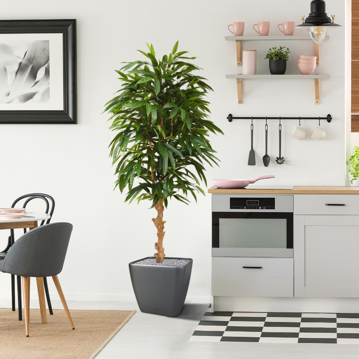 Door zijn echt houten stam, omwikkeld met een liaan en de nagebootste luchtwortels, oogt de boom zeer natuurgetrouw. De kunst Longifolia Royal Deluxe kan in een hoge als ook in een lage sierpot geplaatst worden voor een optimale sfeer.