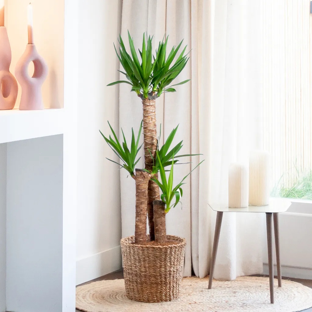 De Yucca, ook wel bekend als Palmlelie, is een indrukwekkende groene kamerplant met stevige, zwaardvormige bladeren die een exotische flair aan je interieur toevoegen. Deze bladeren groeien meestal recht omhoog en geven de plant een uniek en robuust uiterlijk. Deze kamerplant slaat water op in zijn stam, wat hem helpt te overleven in zijn natuurlijke habitat in Midden-Amerika. Hier komt de Yucca oorspronkelijk vandaan en hij is gewend aan een klimaat met veel zon en weinig water. Verzorging De verzorging van deze kamerplant is vrij eenvoudig, wat hem een uitstekende keuze maakt voor zowel beginnende als ervaren plantenliefhebbers. Hij heeft weinig water nodig en kan goed tegen direct zonlicht, mits hij hier geleidelijk aan gewend raakt. Voor een optimale groei is het aan te raden om de Yucca eens per maand van plantenvoeding te voorzien. Dit is vooral belangrijk in de lente en zomer, wanneer de plant actief groeit. De Palmlelie kan enigszins afwijken van de foto en wordt standaard