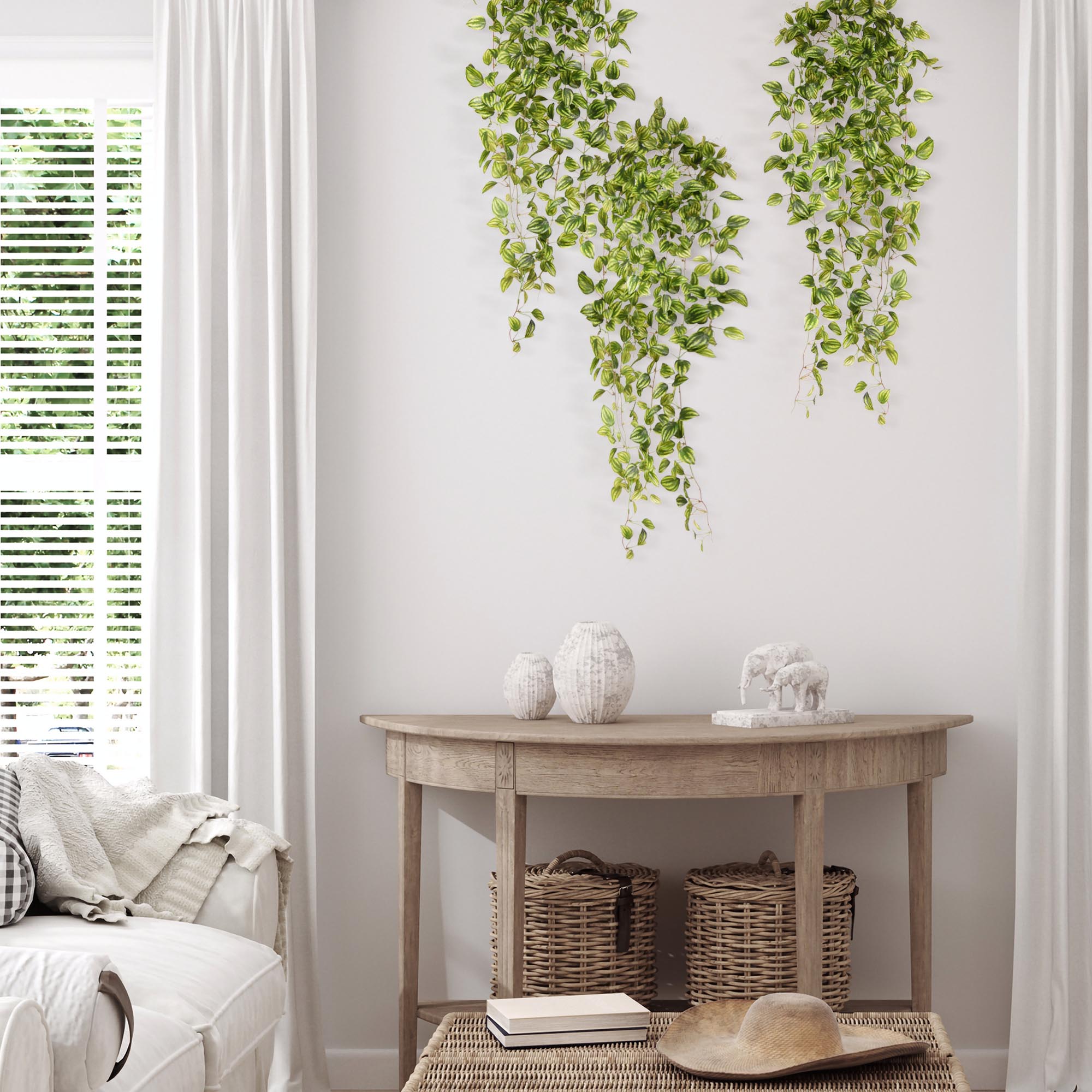 Wow wow wow! Met de kleine felle blaadjes in levendige tinten groen is deze Peperomia kunsthangplant niet te missen! Met 90 cm lang is deze hangplant relatief lang, wat het makkelijk maakt om een muur te decoreren door bijvoorbeeld enkele Peperomia kunsthangplanten naast elkaar te plaatsen. De Peperomia kunsthangplant in de kleur bont is 90 cm lang en heeft blaadjes die naar beneden draperen.