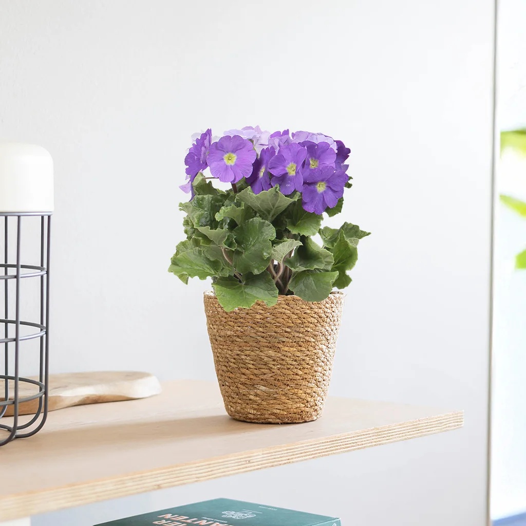 De Primula paars Obconica 'Touch Me', ook wel bekend als de sleutelbloem, is een vrolijke bloeiende kamerplant die direct een kleurrijke boost geeft aan je interieur. Met haar opvallende paarse bloemen is deze plant een echte blikvanger. De ‘Touch Me’-variant is speciaal gekweekt zonder irriterende haartjes op de bladeren, waardoor hij veilig is om aan te raken. Oorspronkelijk komt de Primula Obconica uit China en de Himalaya-regio, waar ze groeit in vochtige, koele omgevingen. Dankzij haar compacte formaat en weelderige bloei is deze plant perfect voor vensterbanken, tafels en bureaus. Ze houdt van een lichte standplaats zonder direct zonlicht en bloeit maandenlang met de juiste verzorging. De Primula Obconica 'Touch Me' is eenvoudig te verzorgen en ideaal voor beginners. Om de bloei te verlengen, verwijder je regelmatig uitgebloeide bloemen. Geef haar matig water en zorg ervoor dat de grond licht vochtig blijft, maar voorkom natte voeten. Een keer per maand wat plantenvoeding helpt
