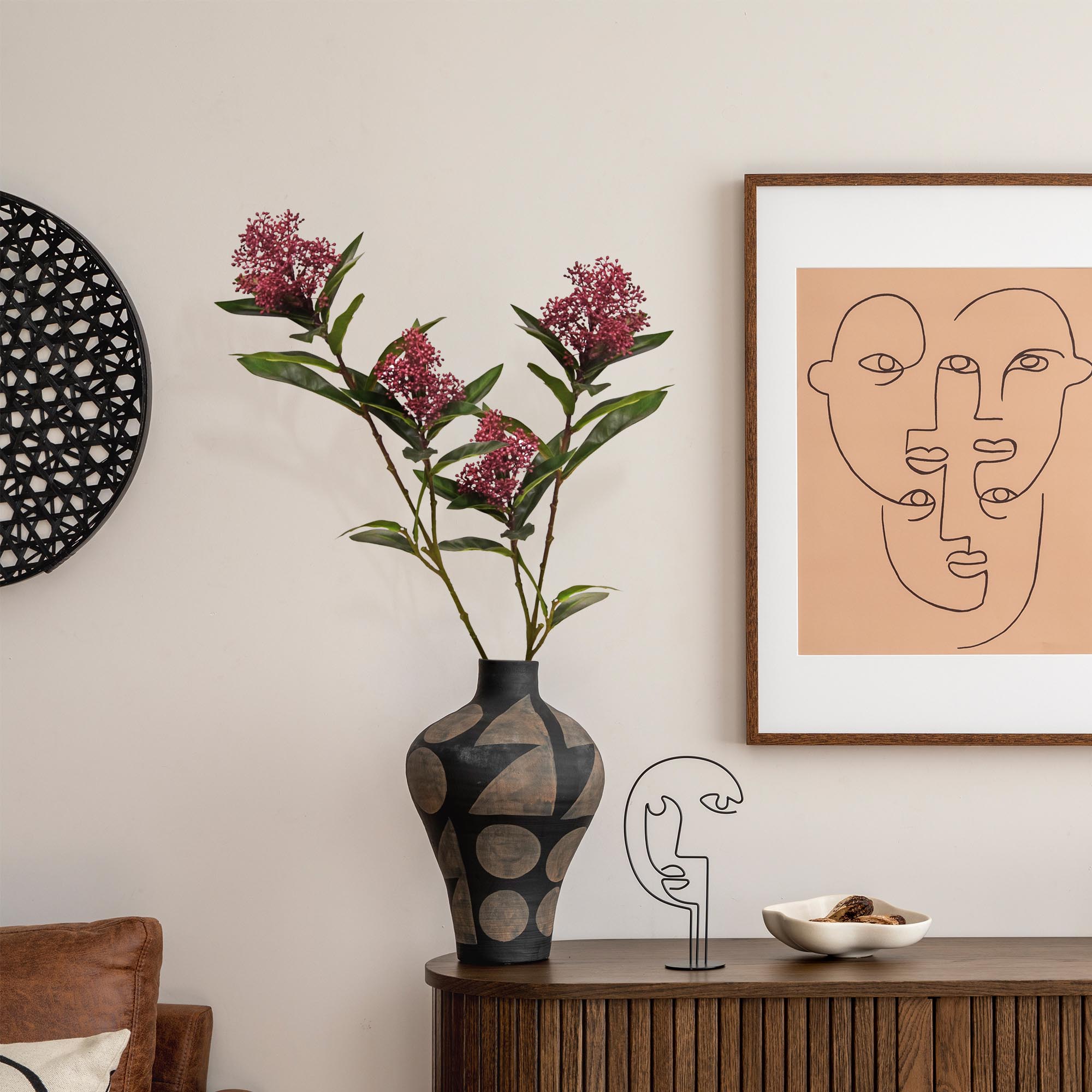 De Skimmia is een winterharde plant die erg populair is in de Nederlandse tuin. De struiksoort is makkelijk te herkennen aan zijn langwerpige, leerachtige bladeren in combinatie met bloemknoppen, vaak in veel verschillende soorten. Deze variant heeft bloemknoppen die prachtig dieprood van kleur zijn. Ideaal om nog even langer van de winter te genieten met deze romatische tak! De Skimmia kunst tak in de kleur burgundy is 70 cm lang.