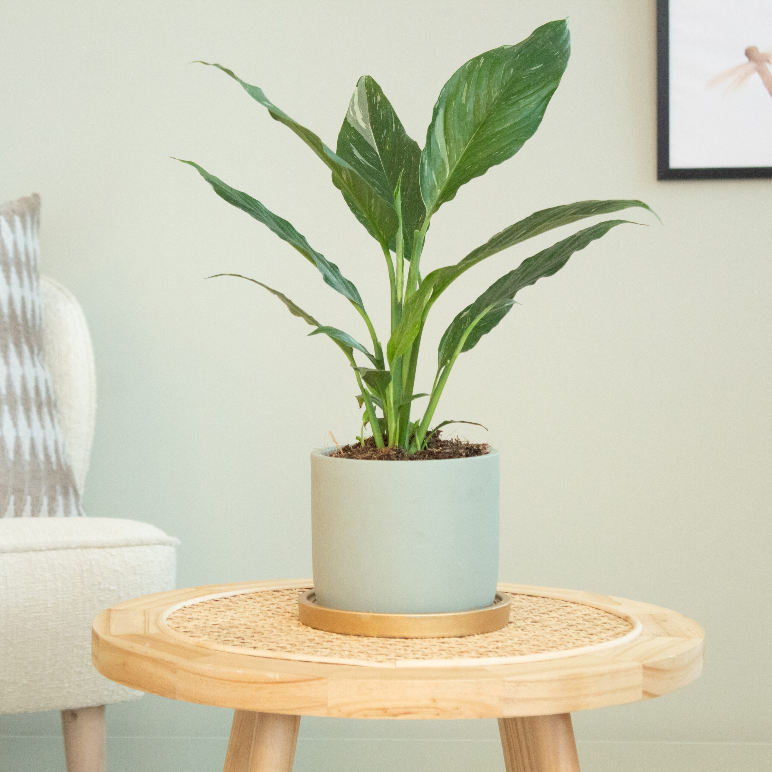 De Spathiphyllum Diamond is een bijzondere () luchtzuiverende kamerplant. De bladeren zijn donkergroen van kleur en hebben prachtige witte variegatie in de bladeren. De bonte exemplaren van de Spathiphyllum kom je nog niet zo vaak tegen. Terwijl andere planten met variegatie vaak lastig te verzorgen zijn, is deze Spathiphyllum niet zo kieskeurig. Hij zal je dan ook snel belonen met veel prachtige bladeren! In de natuur kun je de Spathiphyllum Diamond vinden in het Amazone gebied van Zuid-Amerika. Hier groeit hij op de grond in de schaduw van andere planten! De Spathipyllum wordt inmiddels al een lange tijd gehouden als kamerplant in Europa vanwege de lepelvormige bladeren. In het Grieks betekend ‘Spath’ lepel en ‘phyl’ blad, dus daar heeft hij zijn bijnaam lepelplant ook vandaan! Let op! – De lepelplant is lichtgiftig voor mens en dier. Pas daarom op met huisdieren of kleine kinderen. Lichtbehoefte – Zet de plant op een plekje met schaduw, halfschaduw of indirect licht. Om de