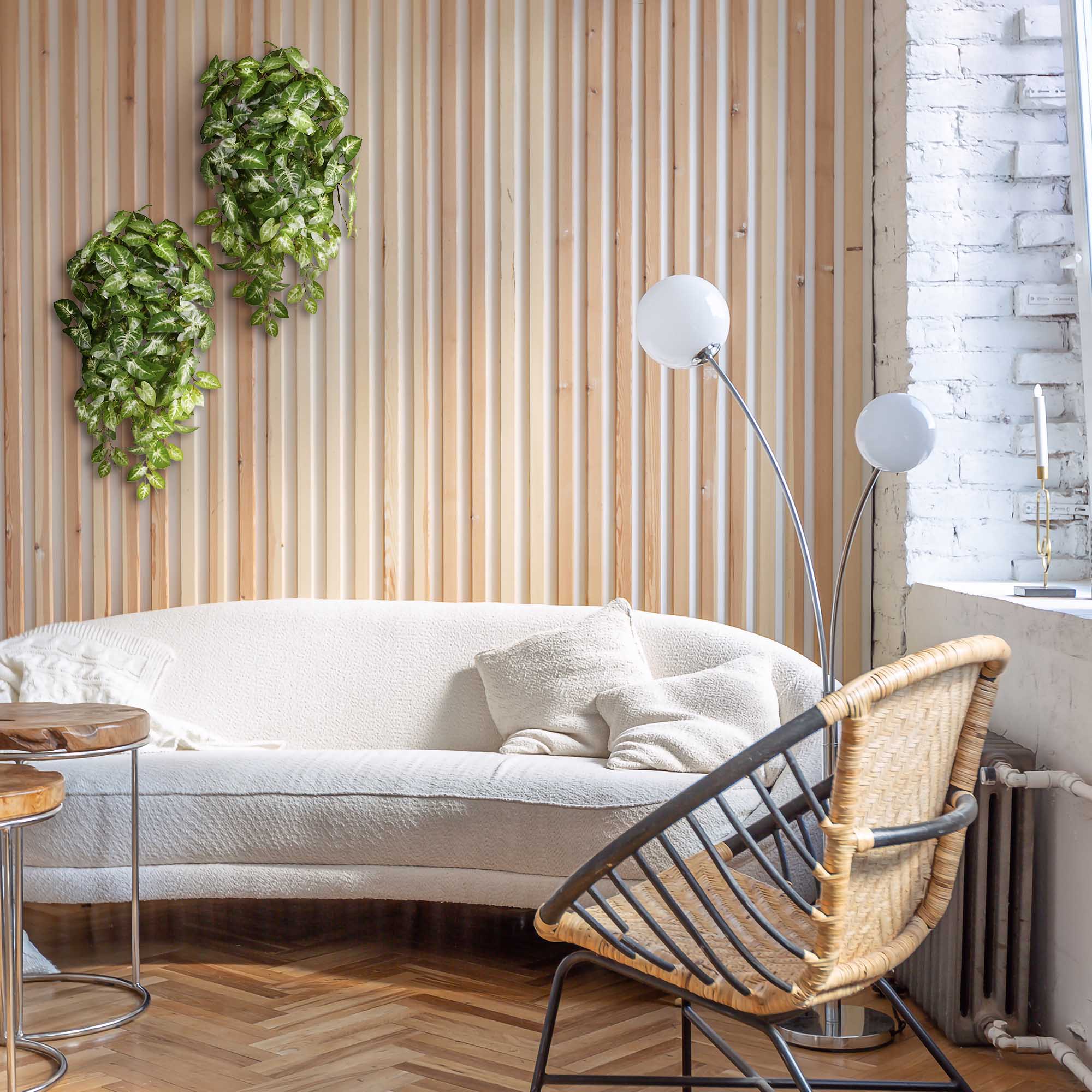 De Syngonium kunsthangplant is 50 cm – 60 cm lang, afhankelijk van het modelleringsproces en bevat een stevige steker aan de achterkant om de kunstplant te kunnen bevestigen. Gebruik 'm bijvoorbeeld in een mini plantenwand, of hang hem in een sierlijk hangpotje.