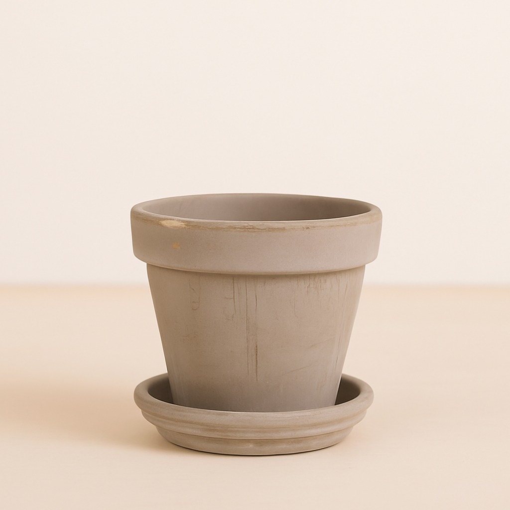 Deze compacte terracotta pot in grijze uitvoering is gemaakt van natuurlijk gebakken klei en wordt geleverd met een bijpassende schotel. Deze pot is geschikt voor planten met een potmaat 14 en heeft een hoogte van 16 cm. Door het ademende karakter van terracotta kan overtollig vocht uit de pot ontsnappen, wat de kans op wortelrot vermindert. De schotel is geïmpregneerd en neemt geen water op – wel zo fijn voor je tafel of vensterbank. De grijze kleur geeft een moderne twist aan het klassieke terracotta en past goed in zowel minimalistische als rustieke interieurs. Door het kleine formaat is deze pot ideaal voor vensterbanken, smalle plankjes of als combinatie in een groepje plantenpotten. Voor een goede verzorging van je plant: begin met een laagje hydrokorrels () onderin en vul aan met verse potgrond (). Hulp nodig bij het verpotten? Lees dan ons blog over wanneer verpotten nodig is (https://www.plantje.nl/blog/wanneer-moet-ik-mijn-kamerplanten-verpotten/) of volg het 8-stappenplan