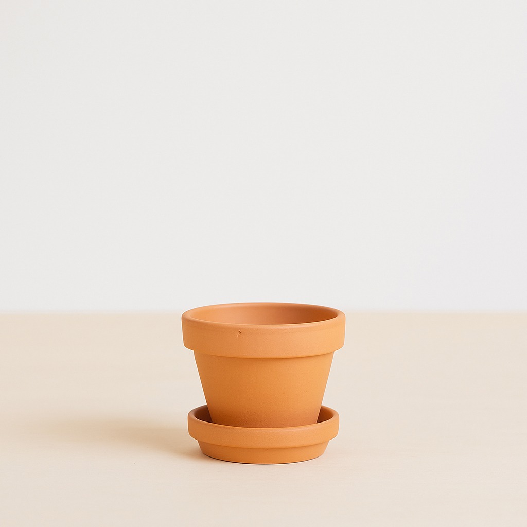 Dit kleine terracotta potje is gemaakt van natuurlijk gebakken klei en wordt geleverd met een bijpassende schotel. Het is geschikt voor planten met een potmaat 8 en heeft een hoogte van 9 cm. Door het poreuze materiaal ademt de pot, wat zorgt voor een gezond klimaat rondom de wortels. De schotel is geïmpregneerd en neemt geen water op – ideaal voor gebruik op je bureau, plank of vensterbank. De klassieke oranje kleur geeft een warme, natuurlijke uitstraling die goed past bij stekjes, vetplantjes of kleine kruiden. Perfect voor wie zijn interieur net dat beetje extra wil geven met een subtiele, tijdloze touch. Ook bij kleine potjes geldt: een goede start is belangrijk. Gebruik eventueel een klein laagje hydrokorrels () en vul aan met verse potgrond (). Meer tips vind je in ons 8-stappenplan voor verpotten (https://www.plantje.nl/blog/planten-verpotten-in-8-stappen/).