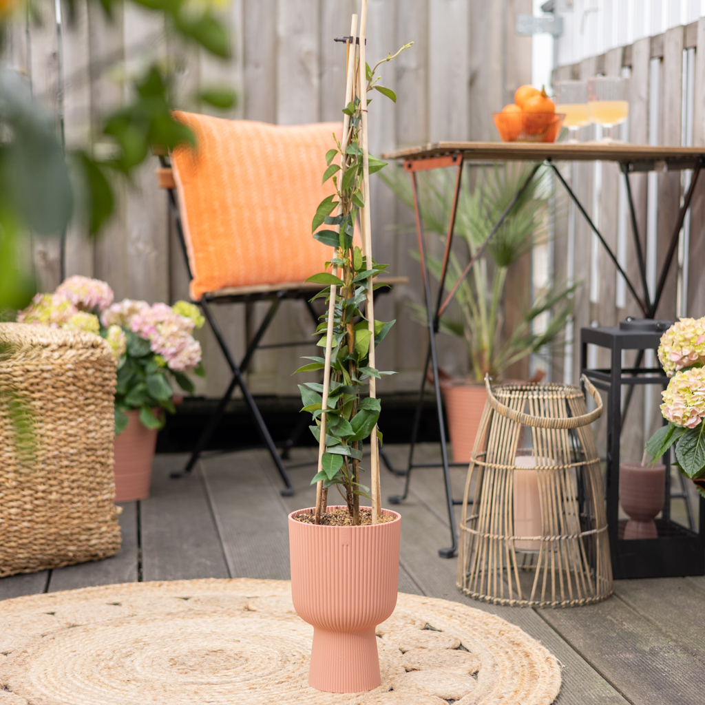 Toscaanse Jasmijn (Trachelospermum jasminoides) is een wintergroene klimplant met heerlijk geurende, witte bloemen. Deze bloemen zijn stervormig, waardoor deze tuinplant ook wel sterjasmijn wordt genoemd. Toscaanse Jasmijn groeit steeds sneller naarmate hij ouder wordt; na enkele jaren groeit de klimplant tot 100 cm per jaar. Uiteindelijk kan hij tot 6 meter hoog én breed worden. Perfect om muren of hekwerken mee te bedekken. De plant bloeit vanaf mei t/m september. Waar veel buitenplanten in de winter alle bladeren verliezen, blijft de Toscaanse Jasmijn groen in de winter. Dit maakt het een ideale buitenplant, het hele jaar door. Je kunt de sterjasmijn zowel in de volle grond als in een pot planten. Zorg er wel voor dat je een grote bloempot kiest, zodat de wortels genoeg ruimte hebben om te groeien. Let op! – Wanneer je de Toscaanse Jasmijn in een pot plant, kun je deze bij strenge vorst het beste inpakken. Lichtbehoefte – Zet de sterjasmijn op een plek in de volle zon. Water geven –