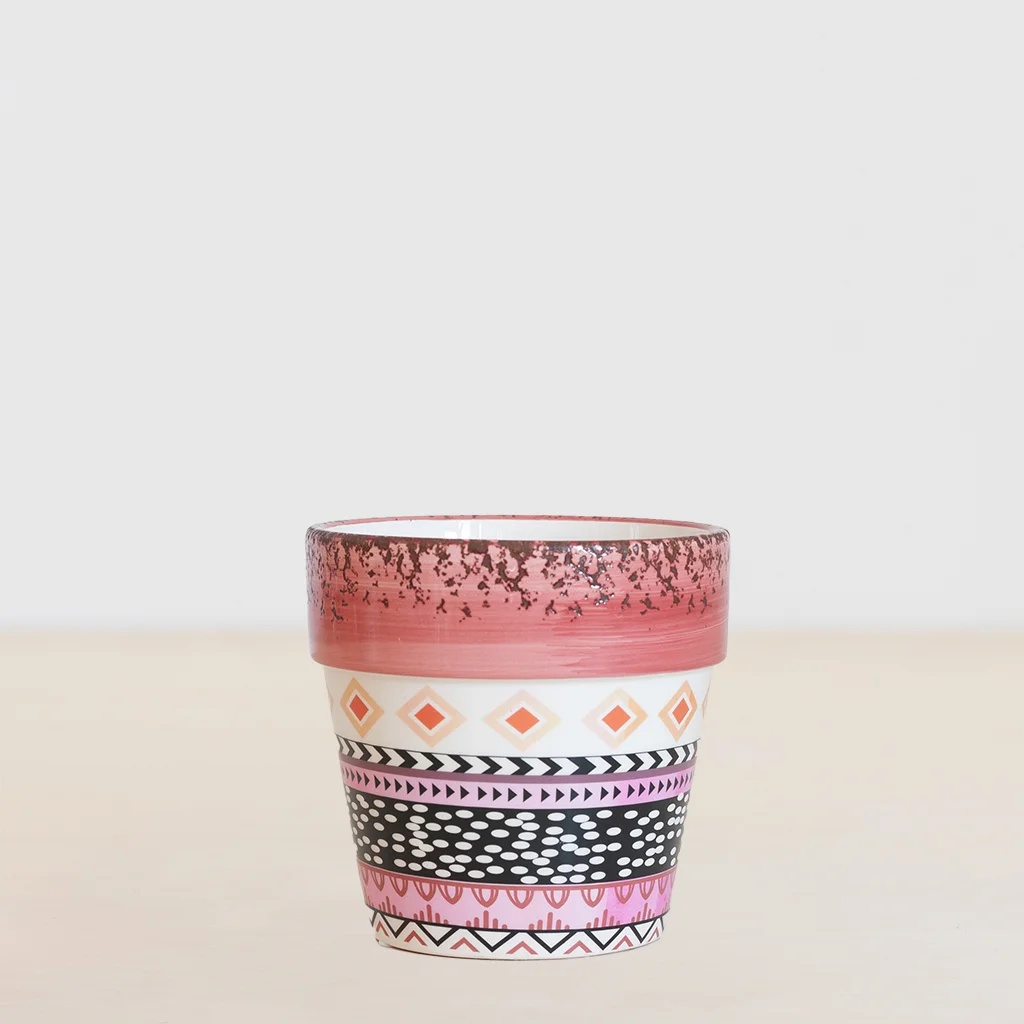De kleurrijke Turijn pot is een opvallende verschijning. De pot is versierd met allerlei geometrische patronen, met o.a. roze, zwarte en gele tinten. De Turijn plantenpot is perfect voor kamerplanten (https://www.plantje.nl/kamerplanten/) met potmaat 12. Vind je dit design leuk, maar ben je op zoek naar een andere kleurenmix? Neem dan een kijkje bij deze plantenpot (), met o.a. zwarte, blauwe en bruine tinten.